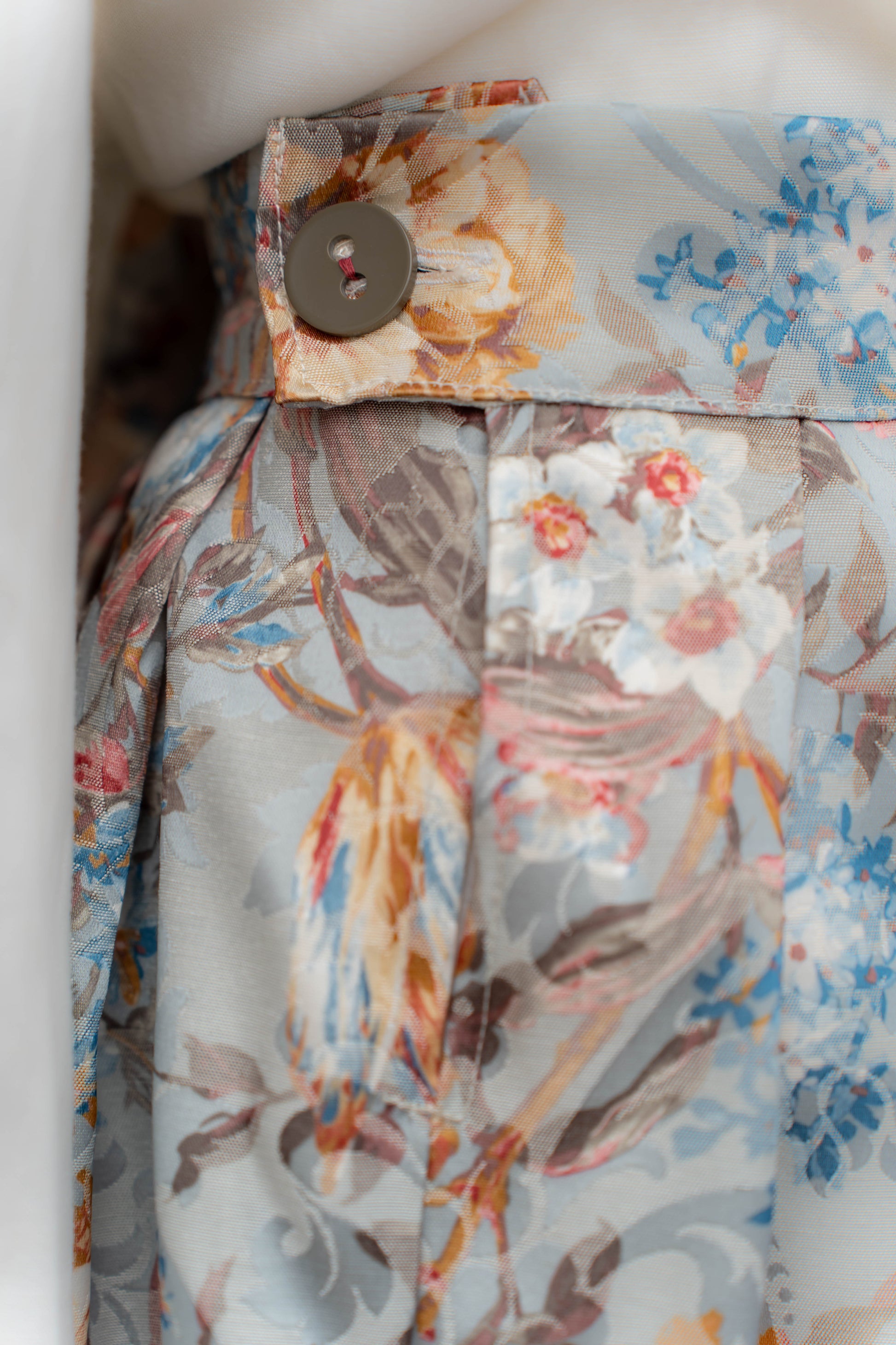 Opulent Floral Print: Adorned with a magnificent Baroque-inspired floral print in a rich palette of dusty blues, warm oranges, soft pinks, and subtle golds. The intricate pattern resembles a tapestry, bringing depth and artistic drama.