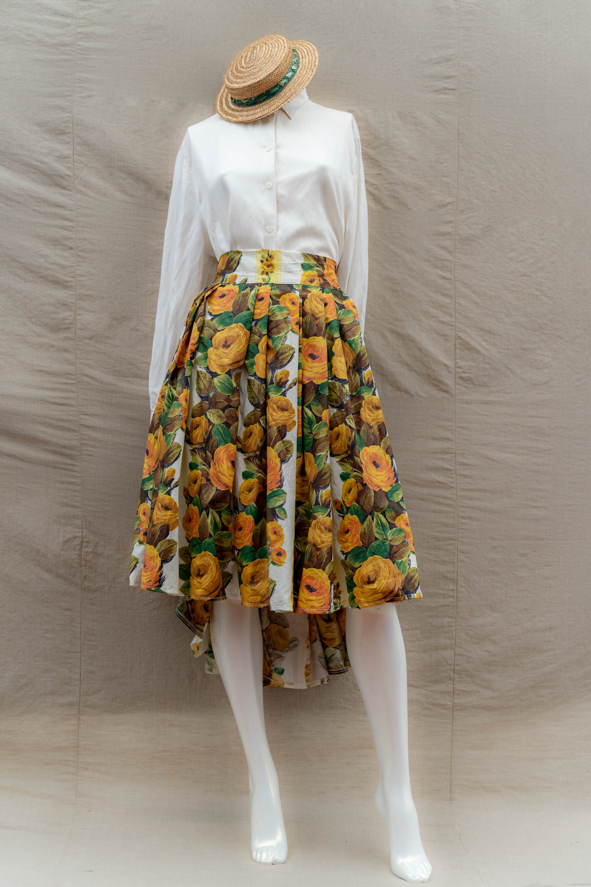 The skirt is tailored with crisp box pleats that create a full, voluminous A-line silhouette, offering graceful movement with every step. Its flattering high-waisted cut makes it a timeless statement piece. Perfect for weddings, special occasions, or any moment you want to feel exceptionally beautiful.
